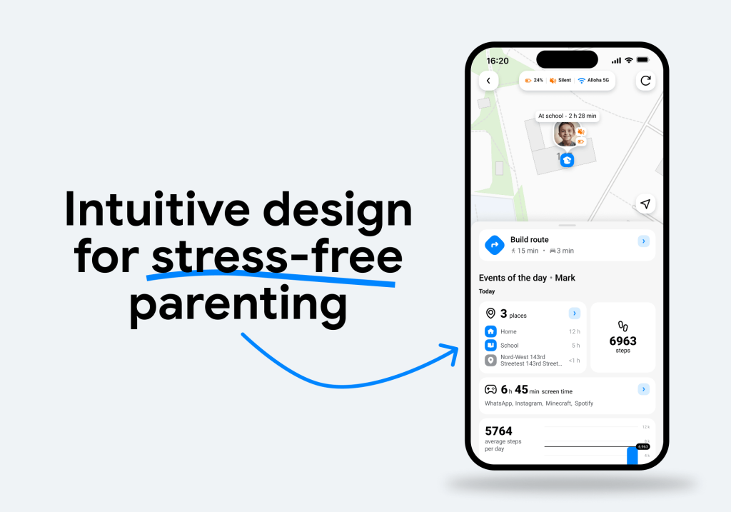 With a cleaner layout and a calming color palette, parents can easily navigate features such as location tracking, route history, screen time statistics, and more. The moment they open the app, they instantly understand where their loved ones are and what’s happening.