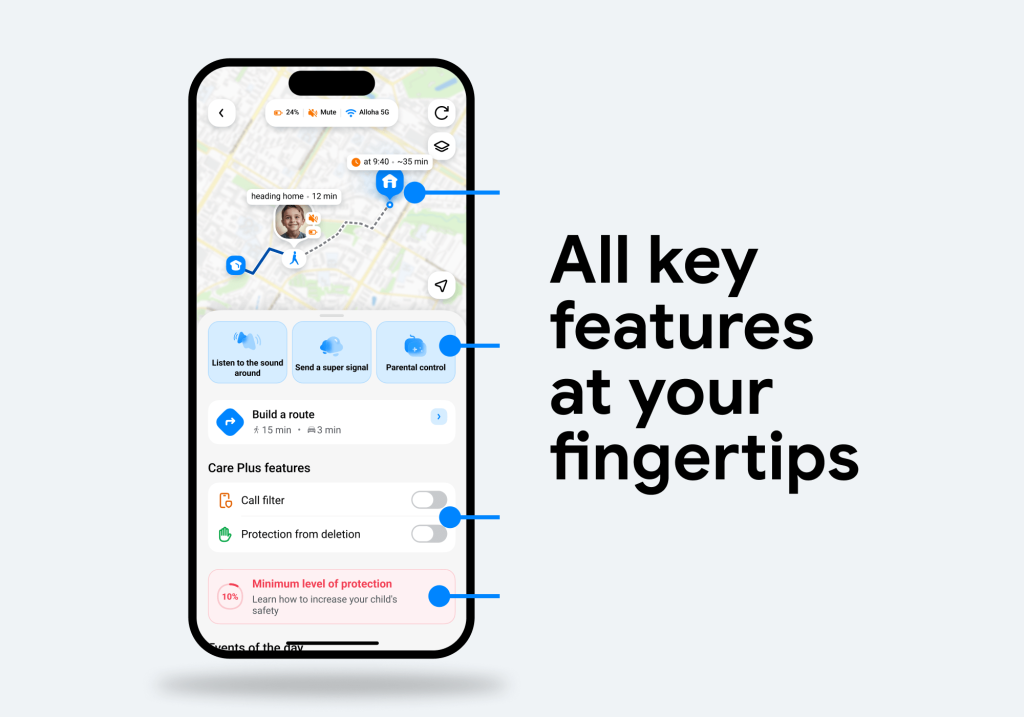 It’s no secret that Findmykids offers a ton of helpful features, from parental controls to getting your child’s attention when their phone is on silent. With the new app design, parents can easily access all of these essential features in just one place.